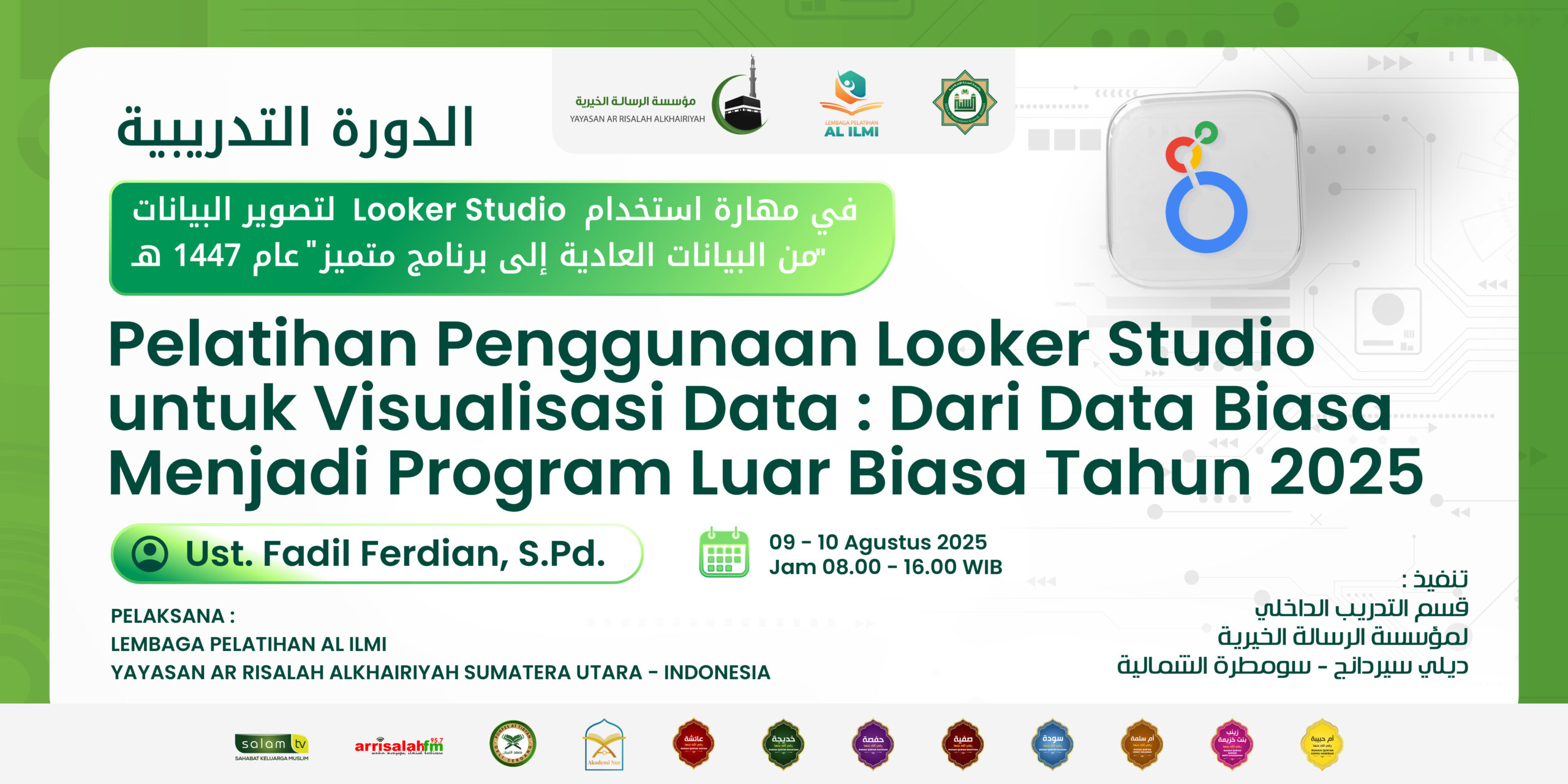 Lembaga Pelatihan Al Ilmi Yayasan Ar Risalah Alkhairiyah sukses menyelenggarakan Pelatihan Penggunaan Looker Studio untuk Visualisasi Data: Dari Data Biasa Menjadi Program Luar Biasa bagi para pegawai Yayasan. Pelatihan berlangsung selama dua hari, mulai pukul 08.00 hingga 16.00 WIB, bertempat di ruang pelatihan Yayasan Ar Risalah Alkhairiyah.
